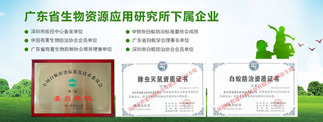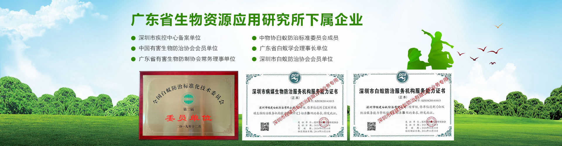 專注于徹底根治、防治結合,售后跟蹤服務,專業服務工程師有豐富實戰經驗超過十年。持有專業資格證書認證:“有害生物防制服務機構服務能力證書B級”、“白蟻防治服務機構服務能力證書B級”所有員工持有“深圳市白蟻防治上崗證”和“深圳市除蟲滅鼠上崗證”,雙資格證上崗服務。榮獲過:“優質服務示范單位”、“白蟻防治服務信譽AAA級單位”、“深圳市白蟻防治先進單位”、“深圳市十大白蟻防治品牌”、“深圳市殺蟲公司”、“深圳市消殺公司”先進單位等榮譽。